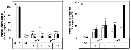 Cellular internalization of carboxyfluoresceinated peptides 6, 7, 10, and 11 normalized (a) with respect to CF-TAT (100%), and (b) as a fluorescence ratio of the peptides with respect to CF as a control of endocytosis (CF fluorescence = 1 a.u.). HeLa cells were incubated with the respective peptide at 10 (empty column), or 25 µM (black column) for 24 h, and the level of fluorescence associated with the cells was assessed by flow cytometry (λEXC = 488 nm and λEM = 530 nm). Results were expressed as mean ± SD. Samples were made in triplicate (p ≤ 0.05, (*); p ≤ 0.01, (**); p ≤ 0.001, (***)). Three independent experiments were carried out.