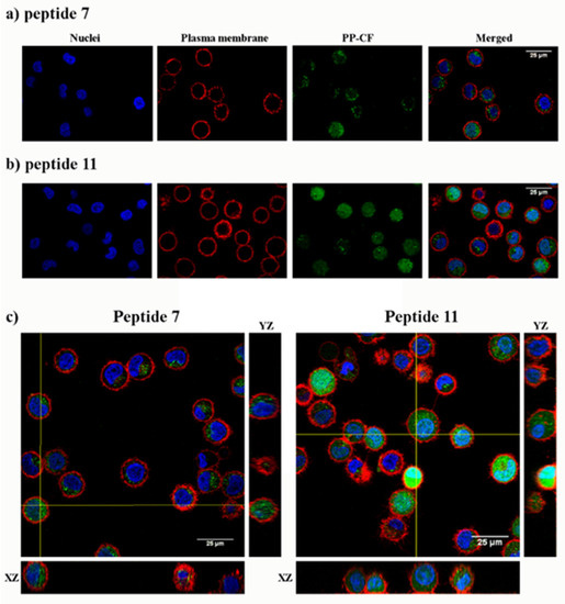 The cell internalization of peptides 7 and 11 in HeLa cells was evidenced by confocal microscopy under identical conditions to flow cytometry. The intracellular fluorescence showed a spotted cytoplasmic pattern after incubation with the peptides at 25 μM peptide (Figure 4). Confocal 3D ruled out their mere association with the plasma membrane.