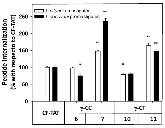 Thus, these γ-CPP are potential cargo carriers at concentrations ≤ 25 μM; over this value, they behave as leishmanicidal agents on their own. This, together with their nil toxicity and poor uptake in mammalian cells, makes them amenable as DDS systems.
