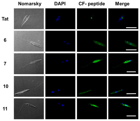 The internalization of these peptides in Leishmania donovani promastigotes was assessed by confocal microscopy on those peptides with the best results in flow cytometry. Thus, promastigotes were incubated with peptides 6, 7, 10 and 11 as well as TAT (Figure 7) at a final concentration of 10 μM for 2 h at 26 °C. DAPI was used as a nucleic acid dye to stain the nucleus and the kinetoplast (blue fluorescence) (Figure 7).