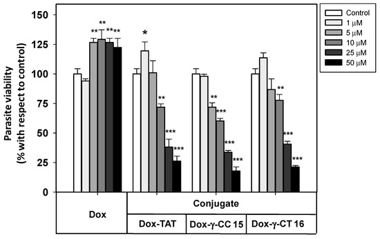 Viability of Leishmania donovani promastigotes treated with Dox-conjugates 15 and 16 along with Dox and Dox-TAT. Parasites were incubated with the respective reagents (20 × 106 cells/mL, 4 h, 26 °C), and MTT reduction measured afterwards. Parasite viability was represented as the percentage of MTT reduction ± SD with respect to untreated parasites. Statistical significance with respect to control parasites: p ≤ 0.05 (*); p ≤ 0.01 (**); p ≤ 0.001 (***). Samples were made in triplicate. Results from one out of three independent experiments were represented.