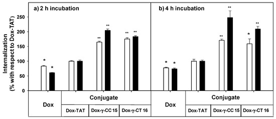 Uptake of free- and peptide-conjugated doxorubicin by Leishmania donovani promastigotes at (a) 2 h incubation, (b) 4 h incubation. Doxorubicin uptake was quantified by flow cytometry using the doxorubicin fluorescence setting (λEXC = 488 nm; λEM = 515 nm) after incubation of the parasites (20 × 106 cells/mL, 26 °C in HBSS-Glc) for (a) 2 h, and (b) 4 h. Data were represented as percentage ± SD with respect to the uptake of the Dox-TAT conjugate. Reagent concentration: 5 μM (white columns); 10 µM (black columns). Samples were made by duplicate (p ≤ 0.05, (*); p ≤ 0.01, (**)). Dox: doxorubicin; HBSS-Glc: Hanks buffered saline solution and glucose.