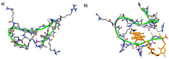 The trajectories of both CC and CT diastereomeric peptides converged into defined folded states after ~40 ns. In all of them, a hydrophobic core was formed and the polar guanidinium groups of the positively charged residues faced the solvent. A double hairpin motif was predominant for γ-CC 5 (Figure 10a), promoted mostly by diverse inter-residue hydrogen-bonds (Figure S7a). These hairpins, and also β-sheet-like structures, have been observed for similar peptides based on cis-γ-amino-l-proline [67]. For the conjugate (R)-Dox-γ-CC, (R)-15, a stable conformation occurred after ~75 ns, with the Dox moiety being partially buried in the main peptide scaffold (Figure 10b). This perturbation of the original double hairpin by the presence of Dox is the consequence of long-range hydrogen-bonding between the primary hydroxyl group of the cyclohexane side-chain in the Dox moiety and Nα-side-chain CO in proline residue i = 8 (Figure S7b).