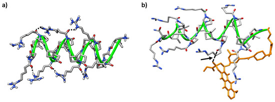 Representative MD conformations for (a) peptide γ-CC 5 and (b) conjugate (R)-Dox-γ-CC, (R)-15. The peptide scaffold is highlighted by the green ribbon; Dox is represented in orange; the arrow points out long-range hydrogen-bonding between the primary hydroxyl group of the cyclohexane side-chain in Dox moiety and the Nα-side chain CO in proline residue i = 8.