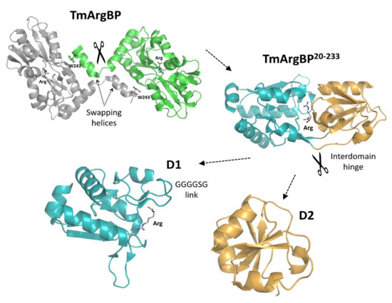 - Smaldone, G.; Balasco, N.; Vigorita, M.; Ruggiero, A.; Cozzolino, S.; Berisio, R.; Del Vecchio, P.; Graziano, G.; Vitagliano, L. Domain communication in Thermotoga maritima Arginine Binding Protein unraveled through protein dissection. Int. J. Biol. Macromol. 2018, 119, 758–769. [Google Scholar] [CrossRef] [PubMed]