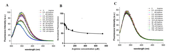 (A) Effect of the arginine binding on the Trp fluorescence of TmArgBP20−233_F76W. The concentration of the protein was 45 µM. (B) Maximum of the fluorescence intensity is reported as a function of the concentration. (C) Fluorescence measured on a TmArgBP20−233_F76W sample that was initially saturated with arginine and then extensively washed.