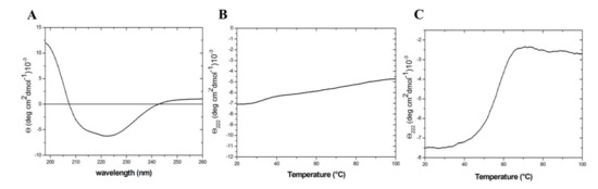 Spectroscopic characterization of TmArgBP20−233_F76W: Far-UV circular dichroism (CD) spectrum (A), thermal denaturation curves in phosphate buffer saline (PBS) buffer (B) and in PBS buffer containing 4.0 M GuHCl (C).