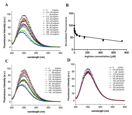 All tryptophan fluorescence spectroscopy experiments were performed using CARY Eclipse Fluorescence Spectrophotometer (Varian Inc. Santa Clara, CA, USA) and a 100 µl quartz cuvette. The excitation wavelength was fixed to 263 nm and emission spectra were collected between 300 and 500 nm with a slit width of 5 nm. The temperature was kept constant at 25 °C. To measure arginine interactions, recombinant proteins were used at a concentration of 45 µM in Tris buffer (pH 8.0) and the fluorescence spectra were reordered with increasing concentrations of ligand from 0 to 730 µM. Control buffer titrations to protein solutions were performed in parallel for background determination in each experiment. Data derived from three independent experiments were analyzed using nonlinear regression with GraphPad Prism 6 by applying the binding model “One Site- Total”. To test the reversibility of the ligand binding, after the analysis, the protein–ligand mixture was rinsed with Tris buffer three/four times using a centrifugal device (Amicon Ultra centrifugal filter, Millipore). After the washing, the arginine binding was tested again by TFS.