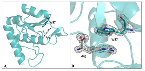 Crystal structure of the arginine-bound D1F57W from TmArgBP. The arginine ligand and W57 residue are shown as sticks (A). |2Fo− Fc| electron density map, contoured at 2.0 σ, of the arginine ligand and of the mutated residue W57 (B).