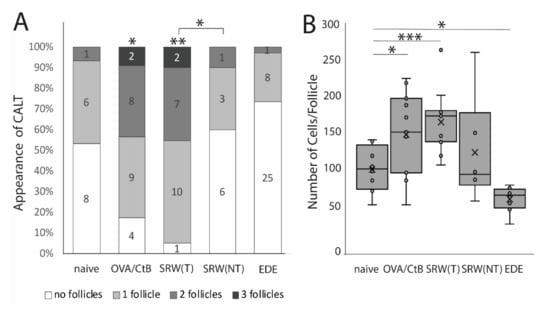 To prove the existence of defined CALT follicles, sections were analyzed for the expression of CD4+, CD8+ T-cells, B-cells, and surrounding blood- and lymph vessels according to the definition published previously [11,39] (Figure S2). Only follicles with defined characteristics of CALT were included in further histological analysis. To estimate the size of CALT, the total number of cells was calculated. The number of all cells was added, and the result was divided by the number of slides analyzed. For the calculation of specific APCs, the most central section of each follicle was chosen. The number of APC was related to the average total cell number of the follicle. To compare CALT in the different models, the number of antigen-presenting cells (APC) was related to the total cell number of the follicles.