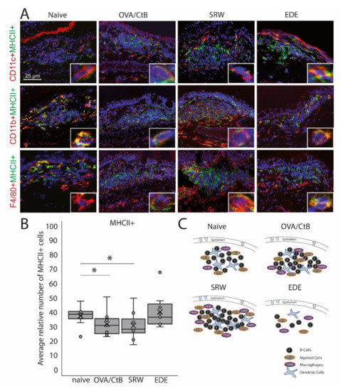 CD11b+, CD11c+, F4/80+ positive, and B-cells were identified in CALT histologically. CALT follicles were examined regarding the spatial organization of these cells. B-cells were organized in a central zone, whereas CD11c+ cells were randomly distributed within the B-cell zone. In the periphery F4/80+ and CD11b+ cells were present (Figure 2A,C). These cells revealed MHC II+ signals (Figure 2A). Although the number and size of CALT were increased in OVA/CtB and SRW stimulated eyes, no differences in the total number of MHC II+ cells were found compared to naïve mice. Compared to naïve mice, the relative number of MHC II+ cells (related to the total cell number per follicle) was significantly decreased after OVA/CtB and SRW stimulation (Figure 2B).