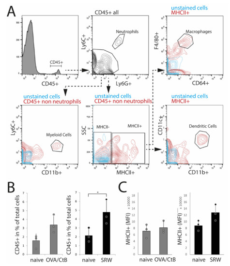 Flow cytometry analysis of isolated nictitating membrane tissues (CALT). (A) Gating strategy. (B) After SRW stimulation, the number of CD45+ cells was increased compared to naïve mice, reflecting the increased number and size of CALT. In OVA/CtB stimulated mice, the number of CD45+ cells was increased by trend (p = 0.07). (C) Median fluorescence intensity (MFI) of MHC II+ cells within the CD45+ non-neutrophils gate. No differences were found. (n = 3 independent experiments, n = 5 mice pooled/sample; * p < 0.05).