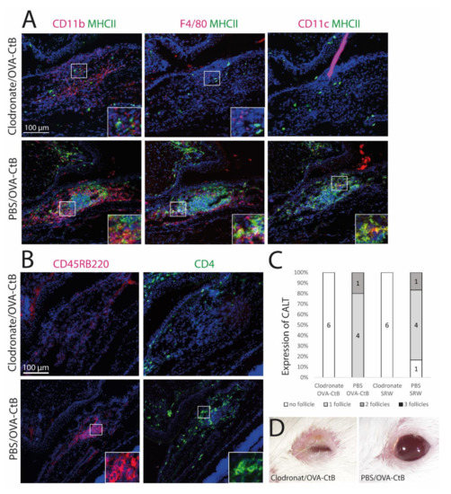 Mice were treated with sub-conjunctival injections of clodronate liposomes to deplete conjunctival mononuclear phagocytes (MNPs) and subsequently stimulated with topical OVA/CtB or SRW. Clodronate induced depletion of the MNPs inhibited CALT formation, whereas control mice receiving PBS liposomes developed CALT in 100 % (Figure 4C). Mice treated with clodronate showed only sparse cellular infiltration without a spatial, defined structure of CALT. Few CD11b+, CD11c+, or F4/80+ cells were present, all without MHC II (Figure 4A,B: upper row). PBS (phosphate-buffered saline) injected control mice developed regular CALT follicles, with a distinct B-cell and T-cell zone (Figure 4B: lower row) and MHC II+ APCs (Figure 4A: lower row). Moreover, after CALT depletion, mice developed severe blepharitis after topical stimulation with OVA/CtB. PBS injected control mice treated with topical OVA/CtB were protected and maintained a healthy lid phenotype (Figure 4D).