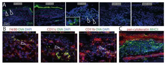To investigate the ability of CALT to uptake soluble and particulate antigen and a possible presentation by APCs, fluorescent OVA was applied to the ocular surface of KLH/CtB (keyhole limped hemocyanin/Choleratoxin B) stimulated mice. Fluorescent OVA was detected as a gradient constructed predominantly above the lymphoepithelium 15–30 min after application (Figure 5A). 60 min after application, OVA was detectable within CALT, 120 min after application, the visual quantity of OVA was declined, and 360 min after the application antigen was no longer detectable in CALT. Furthermore, a co-localization of OVA with CD11b+, CD11c+, as well as F4/80+ cells, was demonstrated (Figure 5B). Epithelial cells did not express MHC II (Figure 5C).