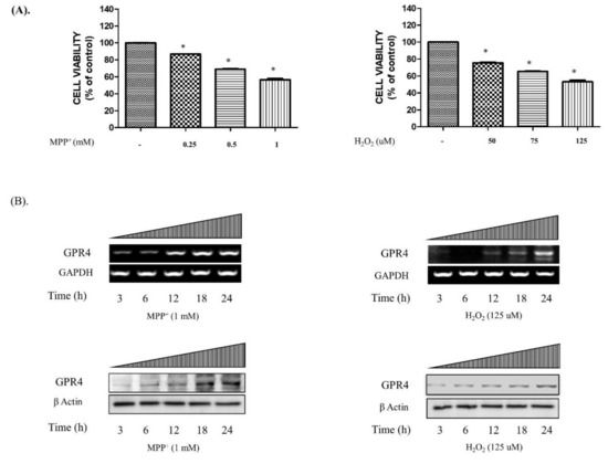 Human-derived neuroblastoma SH-SY5Y cells are widely used in neuroscientific research as an in vitro model for the investigation of neuronal differentiation and neuroprotective events. Stimulation with several neurotoxins, such as MPP+, MPTP, rotenone, 6-OHDA, and H2O2, has been utilised to induce oxidative stress-mediated apoptotic death, thereby mimicking neurodegenerative diseases, including PD and aging [39,40,41]. To determine the final concentration of H2O2 and MPP+, SH-SY5Y cells were treated with H2O2 at different concentrations, ranging from 75 μM to 125 μM, for 24 h, as well as with MPP+, ranging from 250 µM to 1 mM. H2O2 and MPP+ both decreased the cell viability in a concentration-dependent manner, with optimum cytotoxicity being observed at concentrations of 125 μM for H2O2 and 1 mM for MPP+; these concentrations were selected for further experiments to determine their cytotoxicity in the serum-free SH-SY5Y cell line. In our study, GPR4 mRNA and protein expressions were increased in a time-dependent manner for 24 h in both MPP+- and H2O2-treated SH-SY5Y cells. Hence, GPR4 is directly linked with MPP+- and H2O2-induced apoptotic cell death.