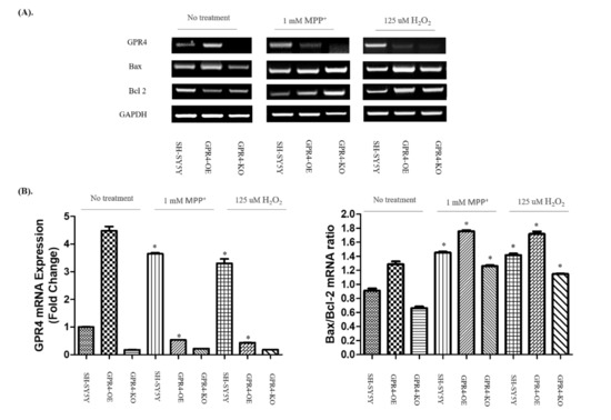 To determine the role of GPR4 in both MPP+- (1 mM) and H2O2- (125 µM) stimulated apoptotic cell death, we investigated the expression levels of the Bcl-2 family proteins (Bax and Bcl-2). Many studies suggest that the Bcl-2 family plays a critical role in the mitochondrial apoptotic pathway. Bax enhances the release of cytochrome C from the space of the mitochondrial intermembrane to the cytosol, resulting in apoptosis. In contrast, Bcl-2 prevents apoptosis through its prevention of cytochrome C release, thereby maintaining mitochondrial cellular integrity [29,30]. In this study, an RT-PCR was employed to assess the mRNA expression levels of GPR4, Bax, and Bcl-2 in 24 h serum-starved SH-SY5Y cells treated with either MPP+ (1 mM) or H2O2 (125 µM; Figure 3A).