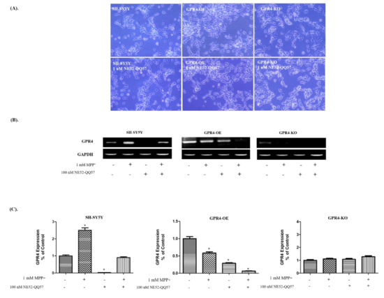 To investigate the effect of the pharmacological inhibition of GPR4, we adopted a GPR4 antagonist, NE52-QQ57. At the physiological pH, NE 52-QQ57 has been reported to effectively block the cAMP that is released by GPR4 activation (IC50 26.8 nM) in HEK293 cells [3]. In this study, the impact of GPR4 antagonist, NE52-QQ57, on the cellular morphology and mRNA expression of GPR4 in MPP+- (1 mM) treated, 24 h serum-starved SH-SY5Y cells was assessed (Figure 4). The SH-SY5Y cells were treated with NE52-QQ57 (1 µM) at pH 7.4 and incubated for 24 h in serum-free culture media, to evaluate the effect of NE52-QQ57 on cell morphology and viability. However, no morphological alteration or cellular toxicity was observed in the control SH-SY5Y, GPR4-OE, or GPR4-KO cells (Figure 4A).