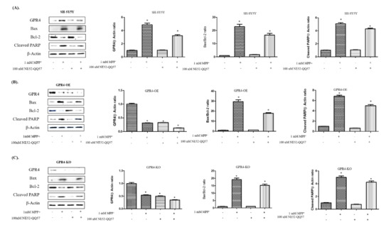 The effect of GPR4 antagonist, NE52-QQ57, on the GPR4 and pro-apoptotic protein expressions in MPP+-treated SH-SY5Y cells that were stably GPR4-OE or GPR4-KO. 24 h serum-starved SH-SY5Y cells were pre-treated for 1 h with NE52-QQ57 (100 µM); this was followed by MPP+ (1 mM) stimulation for 24 h in serum-free culture media. (A) An immunoblot and semi-quantification of the respective protein expressions of GPR4, Bax, Bcl-2, Cleaved PARP, and β-Actin in SH-SY5Y cells. (B) An immunoblot and semi-quantification of the respective protein expressions of GPR4, Bax, Bcl-2, cleaved PARP, and β-Actin in GPR4-OE cells. (C) An immunoblot and semi-quantification of the respective protein expressions of GPR4, Bax, Bcl-2, cleaved PARP, and β-Actin in GPR4-KO cells. β-Actin was utilised as an internal control. Mean ± SEM (n = 3) was employed to express the data. Tukey’s multiple comparison test was performed using a one-way ANOVA. Each * p < 0.05 refers to the sample concentration compared with the same group of non-treated cells.