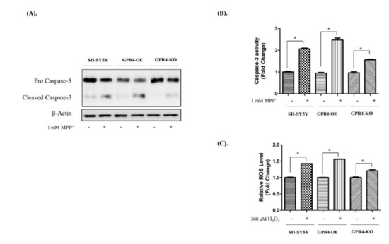 The Caspase-3 activity and intracellular ROS generation in MPP+- and H2O2-treated SH-SY5Y cells that were stably GPR4-OE or GPR4-KO. 24 h serum-starved SH-SY5Y cells were treated with MPP+ (1 mM) for 24 h in serum-free culture media for an immunoblot and a caspase activity assay. SH-SY5Y, GPR4-OE, and GPR4-KO cells were treated with H2O2 (300 µM) for 1 h in serum-free culture media for a 2′,7′-dichlorofluorescein diacetate (DCFDA) assay. (A) An immunoblot of the pro caspase & cleaved Caspase-3 and β-Actin. (B) Caspase-3 activity was measured using a colorimetric assay kit (Sigma, CAS No. CASP-3-C) in MPP+-induced apoptotic cells. (C) The relative intracellular ROS level after 1 h of H2O2 (300 µM) treatment of 24 h serum-starved SH-SY5Y, GPR4-OE, and GPR4-KO cells. β-Actin was utilised as an internal control. Mean ± SEM (n = 3) was employed to express the data. Tukey’s multiple comparison test was performed using a one-way ANOVA. Each * p < 0.05 refers to the sample concentration compared with the same group of non-treated cells.
