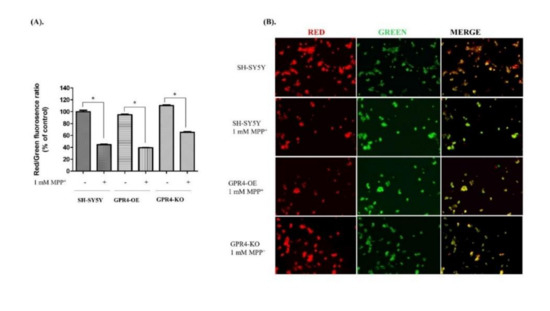 The measurement of mitochondrial membrane potential (MMP) in MPP+-treated SH-SY5Y cells that were stably GPR4-OE or GPR4-GPR4-KO. 24 h serum-starved SH-SY5Y cells were treated with MPP+ (1 mM) for 24 h in serum-free culture media; a JC-10 fluorescence quantitative assay (according to the manufacturer’s instructions) and fluorescence microscopy were then employed to measure their MMP. (A) The percentage ratios of J-aggregates (red) and J-monomers (green). (B) MMP changes were monitored with a JC-10 dye that is detectable through fluorescence microscopy. Mean ± SEM (n = 3) was employed to express the data. Tukey’s multiple comparison test was performed using a one-way ANOVA. Each * p < 0.05 refers to the sample concentration compared with the same group of non-treated cells.