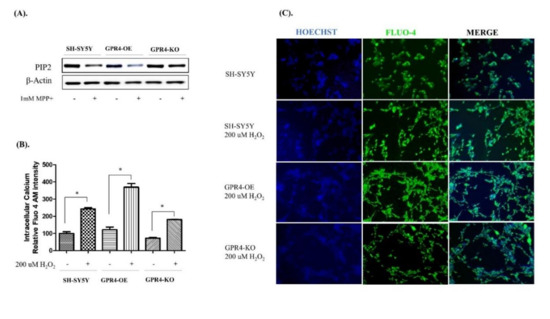 Phosphatidylinositol biphosphate (PIP2) calcium signalling and intracellular calcium levels in MPP+-treated SH-SY5Y cells that were stably GPR4-OE or GPR4-KO. 24 h serum-starved SH-SY5Y cells were treated with MPP+ (1 mM) for 24 h in serum-free culture media for the purpose of immunoblotting. The SH-SY5Y cells were then treated with H2O2 (200 µM) for 2 h 30 min in serum-free culture media and subjected to a Fluo-4 AM fluorescence assay and fluorescence microscopy. Detection of the Fluo-4 AM fluorescence intensity and related imaging were carried out according to the manufacturer’s instructions. Cells were counter-stained with Hoechst dye. (A) An immunoblot of the PIP2 and β-Actin. (B) A quantitative analysis of the Fluo-4 AM fluorescence intensity in H2O2- (200 µM) treated cells. (C) Fluo-4 AM calcium imaging of the intracellular calcium level. Mean ± SEM (n = 3) was employed to express the data. Tukey’s multiple comparison test was performed using a one-way ANOVA. Each * p < 0.05 refers to the sample concentration compared with the same group of non-treated cells.