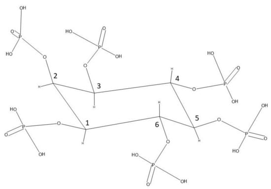 Phytate molecule in the 1ax/5eq conformation. Redrawn in ACD/ChemSketch after [].