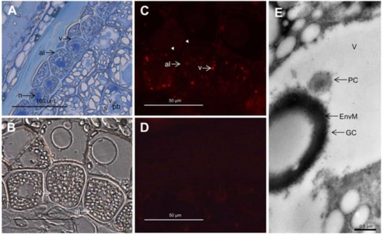 Light (A–D) and immunoelectron (E) microscopy analysis of the localization of PAPhy in the developing wheat grain, approximately 18 days post anthesis. (A) Toluidine blue-stained semithin cross-section of endosperm, aleurone, and pericarp tissues. (B) Differential interference contrast microscopy with indications of the PSVs. (C) Immunofluorescence detection of PAPhy in 1 µm thick sections. The aleurone vacuoles are clearly labeled, while there is no fluorescence from any other compartment of the cell, the apoplast (arrowheads), or other cell types. (D) Immunofluorescence of a 1 µm thick section incubated with secondary antibody only. There is virtually no background from the secondary antibody. (E) Immunoelectron microscopy analysis showing an aleurone PSV with gold labeling of the protein crystalloid. al, Aleurone; EnvM, globoid enveloping membrane; GC, globoid crystal; n, nucleus; pb, protein body; PC, protein crystalloid; s, starch; v, vacuole. Reprinted in part from []. Copyright: American Society of Plant Biologists; http://www.plantphysiol.org.