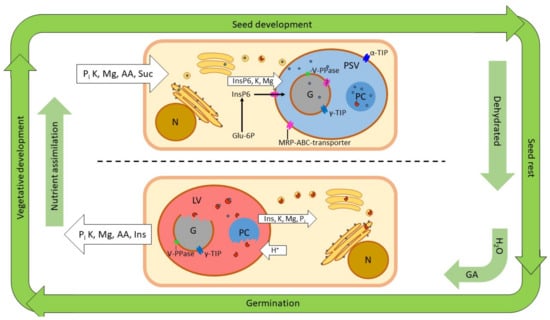 Germination commences when the seeds are rehydrated, the temperature is right, and species-specific requirements to break dormancy have been fulfilled. Gibberellin is produced in the embryo and serves as the hormonal signal, which coordinates the germination events, including the mobilization of the stored nutrients. One of the responses to the GA signal is the acidification of the PSV. For instance, the pH in the PSV of barley aleurone protoplasts decreased from 6.6 to 5.6 in response to external GA. The reaction was detectable after two hours, and was essentially completed after six []. This acidification is key to the PSV transition into a lytic organelle, as it allows for the activity of a multitude of acidic hydrolases (Figure 3). These include proteases that hydrolyze storage proteins, and phytases that act on phytate [,]. The first few days of germination also see extensive morphological changes to vacuolar membrane structures. The multiple PSVs, typically found in storage tissue cells, merge to form one central vacuole [,]. Direct observations of globoids during germination are rare. Bolte et al. (2011) observed globoids in ‘stratified’ Arabidopsis seeds imbibed in the dark and at 4 °C. However, the globoids were gone after 24 hours at 21 °C []. We suggest that the rehydration of the cell, and the acidification of the PSV and the globoids themselves, cause the globoids to rapidly dissolve. The acidification of the globoids themselves is supported by the presence of vacuolar V-PPase in the globoid membrane []. The authors even suggest that phytate itself may drive the proton pump, because phytate can be pyrophosphorylated. The detection of pyrophosphorylated phytate (PP-InsP6) in barley aleurone cells by Brearley and Hanke (1996) lends support to this hypothesis []. More recently, the occurrence of PP-InsP6 was studied in Arabidopsis, and the presence in Camelina sativa L., cotton (Gossypium hirsutum L.) and maize was also confirmed []. The synthesis of PP-InsP6 can occur through an auxiliary catalytic activity of ITPK, which also participates in phytate biosynthesis (see Section 2.1). PP-InsP6 is receiving increasing attention as a signal molecule in plants; for instance, in phosphate sensing []. The cofactor requirements of V-PPase further support a close association with the globoid content. Mg is necessary for the activity of mung bean V-PPase, and K stimulates the activity []. It is therefore possible that the remobilization process is self-propelled, and accelerates with the dissolving globoid, providing more and more substrate for the V-PPase. The globoid membrane also harbors γ-TIP, an aquaporin, which facilitates the influx of water to dissolve the contents []. One possible explanation for the rapid disappearance of the globoids is therefore that accelerating acidification dissolves the contents and causes an osmosis-driven influx of water through γ-TIP, eventually bursting the membrane or causing it to fuse with the tonoplast.