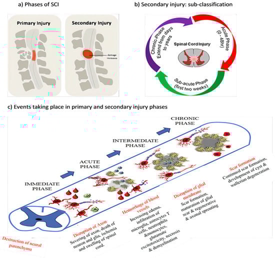 Spinal cord injury (SCI) (a) phases of SCI, (b) sub-classification of secondary injury depending on duration of injury and (c) pathophysiological events according to SCI phases.
