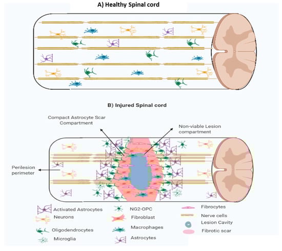 (A) Healthy spinal cord and (B) an injured spinal cord with three lesion compartments, showing inner non-viable small lesion compartment, compact astrocyte core, and perilesion perimeters with multicellular and multi-molecular components (astrocytes, neurons, macrophages, microglia, NG2-OPC, fibrocytes, oligodendrocytes, fibroblast, nerve cells and activated astrocytes) regulating gliosis (gliosis scar formation) post SCI.
