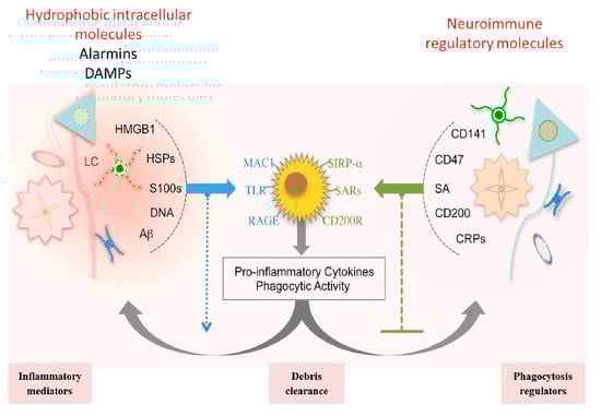 The apoptosis and necrosis are further promoted by the releasing of several molecules such as DAMPs, alarmins, heat shock proteins ab-crystallin, calcium-binding protein S100, DNA binding high mobility group box 1 (HMGB1) [50] (Figure 5). The stimulation of these molecules activates the immune response and promotes the clearance of cellular debris through the stimulation of pattern recognition receptors (PRRs) [52,53] (Figure 5). The secreted alarmins then bind with PPRs to further promote the phagocytosis [52] (Figure 5). The activation of HMGBI then further promotes the activation of multiple molecules such as TLRs, receptors for advanced glycation end products (RAGE), and macrophage antigen complex-1 (MAC1). Simultaneously, the release of NI-Regs and self-defence proteins also initiates proinflammatory signals and phagocytosis [52] (Figure 5).