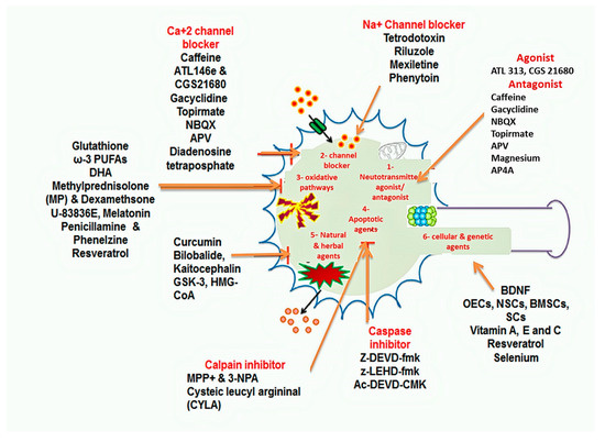 Pharmacological approaches include neuroprotection by drugs and therapeutic agents and can be divided into different subgroups depending on the cascade of degenerative events that are being modulated. The subgroups include (i) neurotransmitter agonist and antagonist, (ii) channel blockers, (iii) anti-oxidative agents, (iv) anti apoptotic agents and (v) herbal and natural agents (Figure 6).