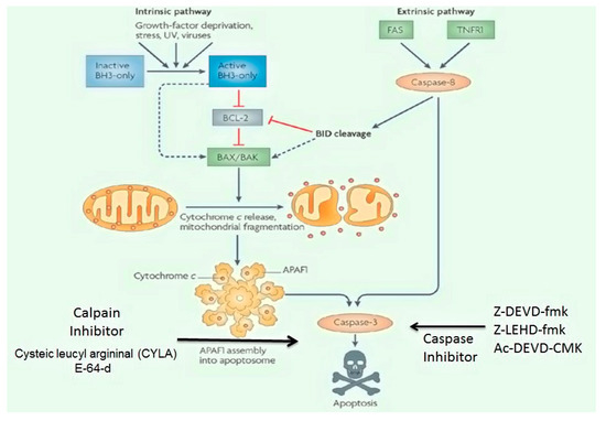 Apoptotic pathway (i) intrinsic pathway and (ii) extrinsic pathway with anti-apoptotic inhibitors, i.e., calpain and caspase that act on specific target molecule and retard apoptosis.