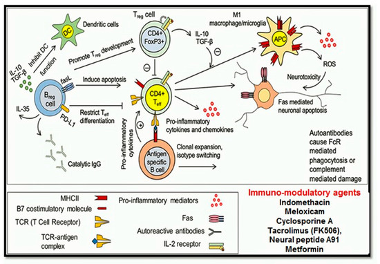 T and B lymphocytes: play a pivotal role in adaptive immune responses, adopt different phenotypes and contribute to injury and repair processes. T cells induce detrimental effects on neurons and glial cells. Teff cells control neuronal cell function by regulating the production of several pro-inflammatory cytokines and chemokines such as IL-1β, TNF-α, IL-12, CCL2, CCL5, and CXCL10 [136]. Treg cells on the other hand control release of anti-inflammatory cytokines IL-10 and TGF-β. Treg cells also regulate Teff cell activation during normal neuronal functioning; however, during SCI, the Teff and Treg balancing regulation got interrupted causing more activities of Teff cells, resulting in the higher release of pro-inflammatory cytokines and chemokines causing the enhancement of Fas-mediated apoptosis [137]. These autoreactive Teff cells promote differentiation of B lymphocytes into autoantibody, which further potentiates neuronal apoptosis [137].