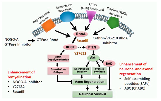 - Wu, X.; Xu, X.M. RhoA/Rho kinase in spinal cord injury. Neural Regen. Res. 2016, 11, 23–27. [Google Scholar]