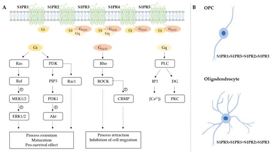 Sphingosine-1-phosphate receptors (S1PRs) expression and main transduction pathways activated in oligodendrocytes progenitor cells (OPCs) and oligodendrocytes. (A) Schematic representation of G-protein coupled receptors and main pathways involved after receptor activation. Sphingosine-1-phosphate receptor 1,2,3,5 (S1PR1,2,3,5); mitogen-activated protein kinase (MEK); extracellular signal-regulated kinases (ERK); phosphatidylinositol 3-kinase (PI3K); phosphatidylinositol (3,4,5)-trisphosphate (PIP3); 3-phosphoinositide dependent protein kinase-1 (PDK1); protein kinase B (Akt); phospholipase C (PLC); protein kinase C (PKC); Rho-associated protein kinase 1 (ROCK); collapsin response mediator protein (CRMP). (B) S1PRs expression levels in human OPCs and oligodendrocytes [71,72,73,74,75].