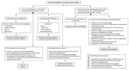 Unlike other malignancies, MM is characterized by osteolytic bone lesions, not bone growth. These invasive bone lesions result in severe bone aches, osteoporosis and pathologic fractures. Osteolytic bone lesions are critically helpful in the diagnosis of MM, as they are identified in about 80% of MM patients through magnetic resonance imaging and computerized tomography [76]. Further, bone marrow incursion by malignant plasma cells leads to anemia, immunosuppression and recurrent infections [77]. Bone marrow biopsy to detect clonal bone marrow plasma cells is essential for the diagnosis and staging of MM [17]. Other standard confirmatory tests include blood calcium and serum creatinine levels, which are often high in MM patients [17]. International Myeloma Working Group (IMWG) published diagnostic benchmarks for MM and its differential diagnosis, including Non-IgM MGUS, IgM MGUS, Light chain MGUS, SMM and solitary plasmacytoma (Figure 1) [11]. The diagnostic criteria depend primarily on the levels of serum or urinary monoclonal protein and the percentage of clonal bone marrow plasma cells. In addition, evidence of end-organ failure (CRAB criteria): hypercalcemia, renal insufficiency, anemia or bone lesions are fundamental for MM diagnosis. In 2014, the IMWG added three critical features to CRAB, which assisted in the early diagnosis and management of MM cases [11].