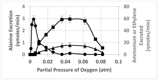 Effect of oxygen partial pressure on alanine excretion, ammonium release and ethylene formation from acetylene by ex planta B. diazoefficiens bacteroids. Assays were performed as described in Section 4. Bacteroid amount was 4.8 mg bacteroid dry weight. Values are the mean plus range of duplicate values; circles—alanine, triangles—ammonium, squares—ethylene.