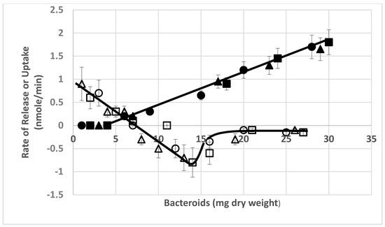 Ammonium is apparently taken up at greater bacteroid densities and over a range of partial pressures of oxygen at greater bacteroid densities (Figure 3B). Ammonium uptake by ex planta B. japonicum (now B. diazoefficiens) bacteroids has been demonstrated previously by Udvardi and Day [39]. The magnitude of apparent ammonium uptake was small relative to alanine release or glutamate uptake (Figure 4). Ammonium was released from ex planta bacteroids in a linear fashion in the absence of l-malate or presence of d-malate. In the presence of l-malate, ammonium levels decline indicating uptake. Alanine release was dependent on the presence of l-malate showing linear accumulation. Glutamate accumulates during anaerobic isolation of the bacteroids, but when exposed to oxygen displays an exponential decline in the absence or presence of l- or d-malate.