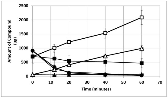 Effect of malate on alanine excretion, ammonium excretion and glutamate uptake by ex planta B. diazoefficiens bacteroids. Ammonium in the absence of l-malate, open squares; ammonium in the presence of 2 mM l-malate, closed squares; glutamate in the absence or presence of 2 mM l-malate, open and closed circles; alanine in the presence of 2mM l-malate, open triangles; and alanine in the absence of 2 mM l-malate or presence of 2 mM d-malate, closed triangles. Note the symbols for glutamate in the absence or presence of malate overlap. Assays were performed as described in Section 4 and contained 19.1 mg bacteroid dry weight and 0.008 atm partial pressure of oxygen. The values are the means of six measurements plus the range.