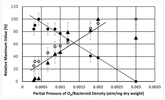 Relative rates of alanine, valine excretion and ammonium uptake from ex planta B. diazoefficiens bacteroids compared by the ratio of partial pressure of oxygen divided by the bacteroid density. The maximum rate of excretion at each partial pressure of oxygen (Figure 4) was divided by bacteroid density for alanine (closed circles), valine (open circles) and ammonium (closed triangles). The maximum rate for each nitrogen compound was set at a value of 100% and all remaining rates for that nitrogen compound were determined as a percent of the maximum rate for each nitrogen compound. All assays performed in the presence of 2 mM l-malate as described in Section 4.