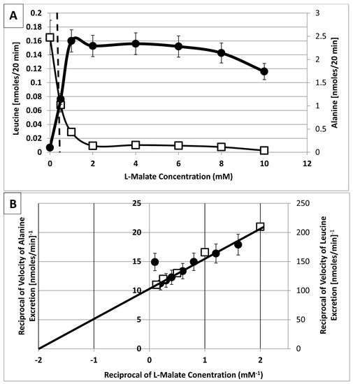 The organic acids, malate, succinate and fumarate have been known to support the greatest rates of ex planta nitrogen fixation of bacteroids [25,37]. Malate was the most abundant citric acid cycle intermediate in soybean nodules [41]. Alanine excretion was dependent on the presence of malate and oxygen partial pressure (Figure 4). Alanine excretion was dependent upon the malate concentration yielding hyperbolic kinetics allowing for the estimation of a K0.5 value for alanine excretion of~0.5 mM l-malate (Figure 7). High concentrations of malate ≥ 10 mM appeared to inhibit alanine excretion. In contrast to alanine excretion, which was dependent upon the concentration of l-malate, the excretion of leucine (Figure 7), valine, isoleucine, glycine, methionine, serine and threonine excretion were inhibited by l-malate, but not d-malate, yielding a K0.5 value of ~0.5 mM l-malate. The hyperbolic results, typical of Michaelis-Menten kinetics, suggest a single rate-defining process, such as an enzymatic reaction or a membrane transport process such as l-malate uptake or alanine release [42].