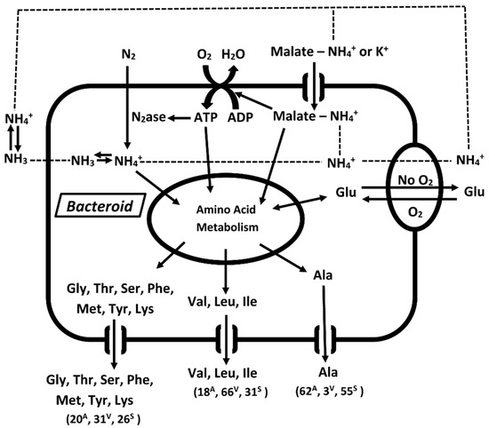 In 1985, Kahn et al. proposed a bacteroid nutrient exchange model in which a carbon compound, such as a dicarboxylate, was assimilated by the bacteroid in exchange for a nitrogen compound, such as an amino acid, released to the plant cells [18]. Subsequently, reports appeared indicating amino acids, in addition to or in place of ammonium, were released from bacteroids [19,20,21,22,23,24,25,26,27], but the ammonium diffusion model has remained as the most often cited mechanism of nitrogen transfer.