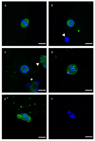 Representative confocal laser-scanning photomicrographs of spindle and chromosome configurations of IVM bovine oocytes after vitrification with or without GSH-OEt pretreatment. (A) Normal barrel-shaped MII spindle with microtubules forming a clear meiotic spindle with chromosomes aligned at its equator. (B,C) Abnormal spindle morphology showing partly disorganised chromosomes. (D) Abnormal spindle structure associated with a disrupted microtubule arrangement and chromosomes appearing condensed. (E) Disrupted microtubule shape. Note the decondensation of microtubules and the less condensed appearance of chromosomes. (F) Single block of condensed chromatin in the absence of microtubules. Scale bar = 10 µm. Green, tubulin (Alexa Fluor™ 488); blue, chromosomes (DAPI). The white arrowhead indicates polar body and white asterisk indicates cumulus cell nuclei.
