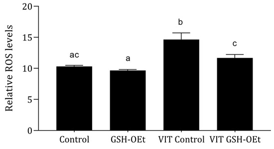 Effect of adding 5 mM GSH-OEt to the IVM medium before vitrification on relative reactive oxygen species (ROS) fluorescence intensity in bovine oocytes. a,b,c Different superscript letters within columns indicate significant differences (p < 0.05). Data are shown as mean ± SEM. Treatment groups: Control, oocytes in vitro matured in IVM medium; GSH-OEt, oocytes in vitro matured in IVM medium supplemented with 5 mM GSH-OEt; VIT Control, oocytes in vitro matured in IVM medium and then vitrified on Cryotops followed by warming; VIT GSH-OEt, oocytes in vitro matured in IVM medium supplemented with 5 mM of GSH-OEt and then vitrified on Cryotops followed by warming.
