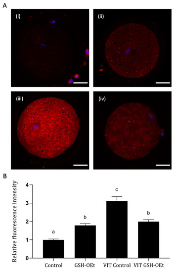 2.2. ROS Production Detected in Vitrified/Warmed Bovine Oocytes after Their Maturation in IVM with or without GSH-OEt