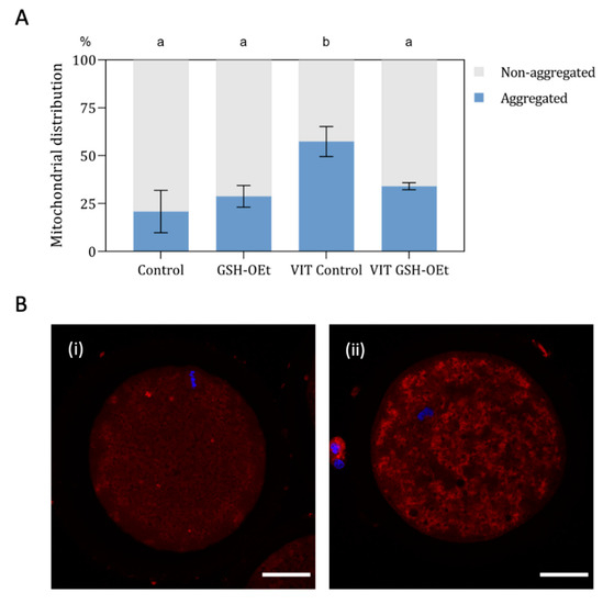 Effect of the addition of 5 mM GSH-OEt to the IVM medium before vitrification on mitochondrial distribution in bovine oocytes. Data are shown as mean + SEM. a,b Different superscripts within columns indicate significant differences (p < 0.05). (A) Distribution of MII oocytes according to mitochondrial distribution pattern: (i) non-aggregated mitochondrial distribution; (ii) aggregated mitochondrial distribution. (B) Representative images of mitochondrial distribution with MitoTracker® Red CM-H2XRos (red) and Hoechst nuclear staining (blue). Mitochondrial distribution was categorized according to the presence or absence of two or more aggregates in the oocyte cytoplasm into (i) non-aggregated or (ii) aggregated. Scale bar = 30 µm. Treatment groups: Control, oocytes in vitro matured in IVM medium; GSH-OEt, oocytes in vitro matured in IVM medium supplemented with 5 mM GSH-OEt; VIT Control, oocytes in vitro matured in IVM medium and then vitrified on Cryotops followed by warming; VIT GSH-OEt, oocytes in vitro matured in IVM medium supplemented with 5 mM of GSH-OEt and then vitrified on Cryotops followed by warming.