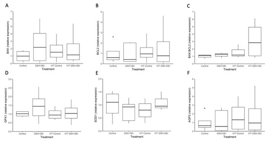 Box-and-whisker plot showing relative gene expression levels of (A) BAX, (B) BCL2, (C) BAX:BCL2, (D) GPX1, (E) SOD1 and (F) AQP3 in MII bovine oocytes in vitro matured in IVM medium with or without GSH-OEt before their vitrification. Box compartments represent 25th and 75th percentiles and whiskers represent maximum and minimum values. The line across the boxes represents the median. BAX, BCL2 associated X, apoptosis regulator; BCL2, BCL2 apoptosis regulator; GPX1, glutathione peroxidase 1; SOD1, superoxide dismutase 1; AQP3, aquaporin 3. Control, oocytes in vitro matured in IVM medium; GSH-OEt, oocytes in vitro matured in IVM medium supplemented with 5 mM GSH-OEt; VIT Control, oocytes in vitro matured in IVM medium and then vitrified on Cryotops followed by warming; VIT GSH-OEt, oocytes in vitro matured in IVM medium supplemented with 5 mM of GSH-OEt and then vitrified on Cryotops followed by warming.