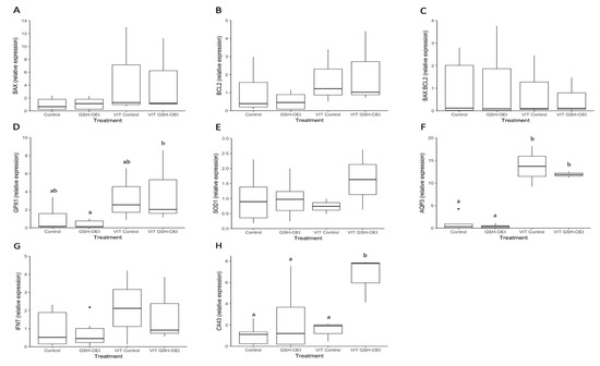 Box-and-whisker plot showing relative gene expression levels of (A) BAX, (B) BCL2, (C) BAX:BCL2 ratio, (D) GPX1, (E) SOD1, (F) AQP3, (G) IFN-τ and (H) CX43 in D8 bovine blastocysts derived from oocytes in vitro matured in IVM medium with or without GSH-OEt before their vitrification. Box compartments represent 25th and 75th percentiles and whiskers represent maximum and minimum values. The line across the boxes represents the median. a,b Different letters indicate statistically significant differences (p < 0.05). BAX, BCL2 associated X, apoptosis regulator; BCL2, BCL2 apoptosis regulator; GPX1, glutathione peroxidase 1; SOD1, superoxide dismutase 1; AQP3, aquaporin 3; IFN-τ, interferon-tau-c2; CX43, connexin 43. Control, oocytes in vitro matured in IVM medium; GSH-OEt, oocytes in vitro matured in IVM medium supplemented with 5 mM GSH-OEt; VIT Control, oocytes in vitro matured in IVM medium and then vitrified on Cryotops followed by warming; VIT GSH-OEt, oocytes in vitro matured in IVM medium supplemented with 5 mM of GSH-OEt and then vitrified on Cryotops followed by warming.