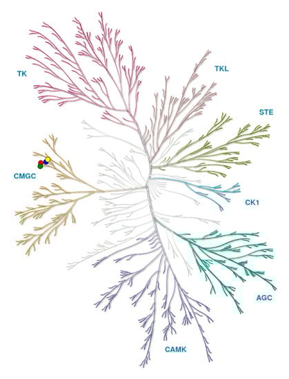 The group CMGC (named after initials of some key members) includes several subgroups: Cyclic Dependent Kinases (CDKs), Mitogen-Activated Protein Kinases (MAPKs), Glycogen Synthase Kinases (GSKs), and CLKs, first reported in 1991 [36,37].